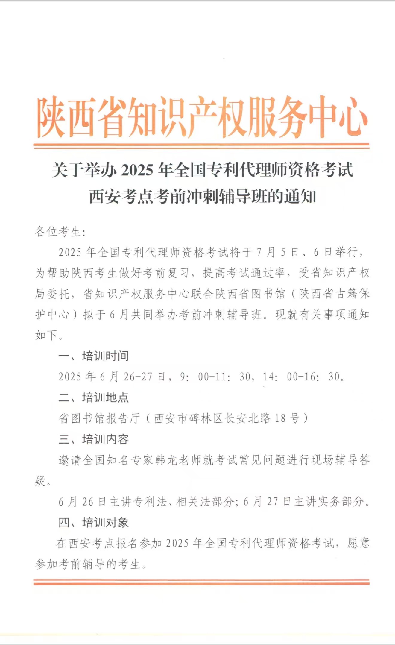 关于举办2025年全国专利代理师资格考试西安考点考前冲刺辅导班的通知