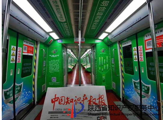 “知识产权地铁宣传专列”是今年陕西省知识产权宣传周主要活动之一,以 “为绿色未来而创新” 世界知识产权日主题和 “知识产权与健康中国” 全国知识产权宣传周主题为主要宣传内容。整车以绿色为主基调,车内看板为知识产权漫画,车门和车窗玻璃上张贴了知识产权宣传标语,车厢连接处为知识产权分类图,车顶是知识产权主题宣传。整车图文并茂,内容详细生动。